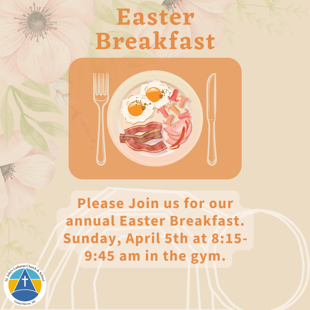Join us for breakfast on Easter morning! The St. John’s youth will host their annual feast 8:15-9:45 a.m. Sunday, April 5th in the gym. Monetary donations will be accepted to support the youth.